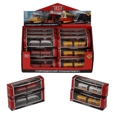 Машина металл ТРАМВАЙ С РЕЗИНКОЙ длина 12 см, в ассорт, дисплей, кор. Технопарк уп-24шт в кор.2*3уп