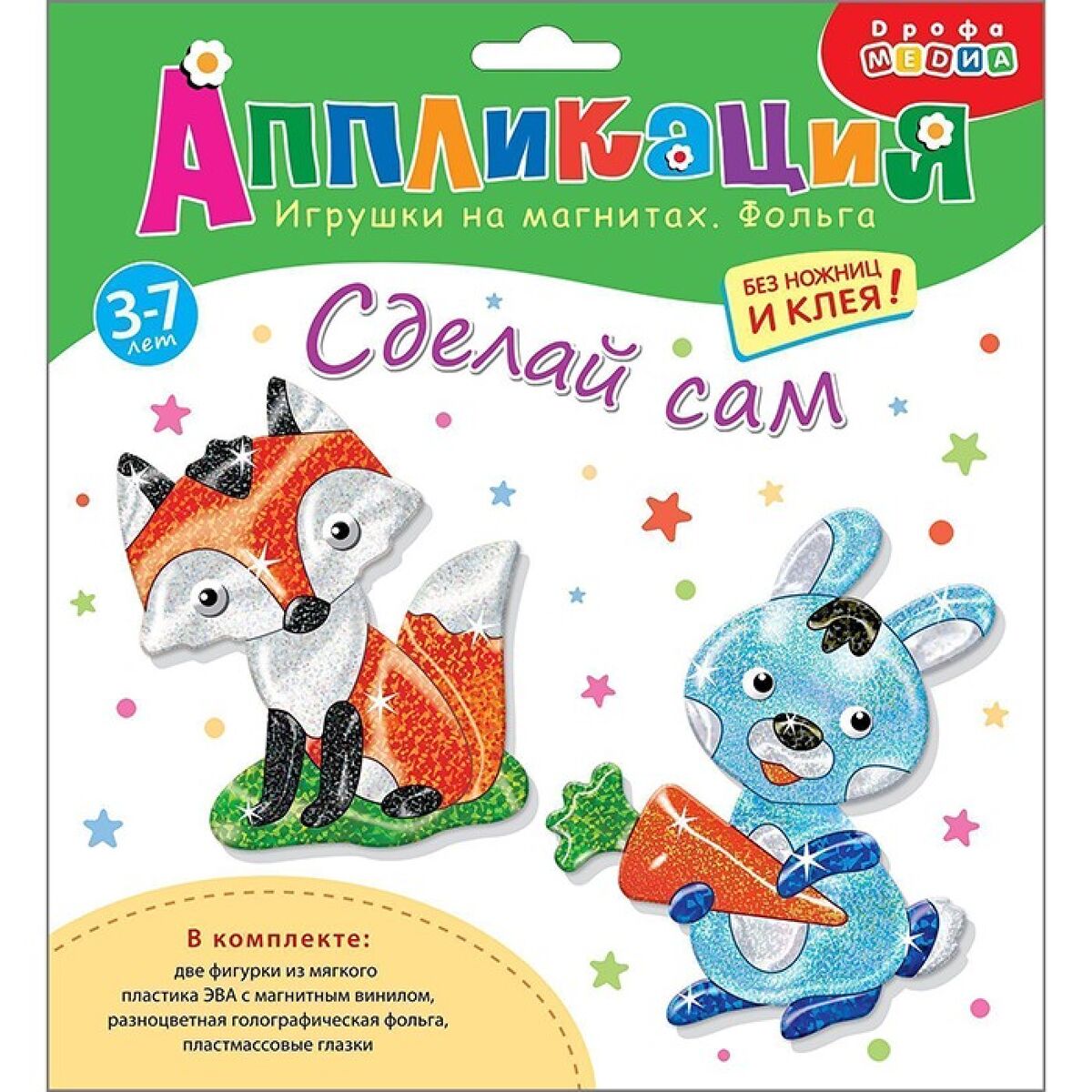 Комплект: 2 основы из ЭВА с магнитным винилом, вырубленные по форме игрушки, на самоклеящейся основе, голографическая фольга (6 цветов), декоративные элементы на самоклеящейся основе (глазки), цветная листовка-образец.