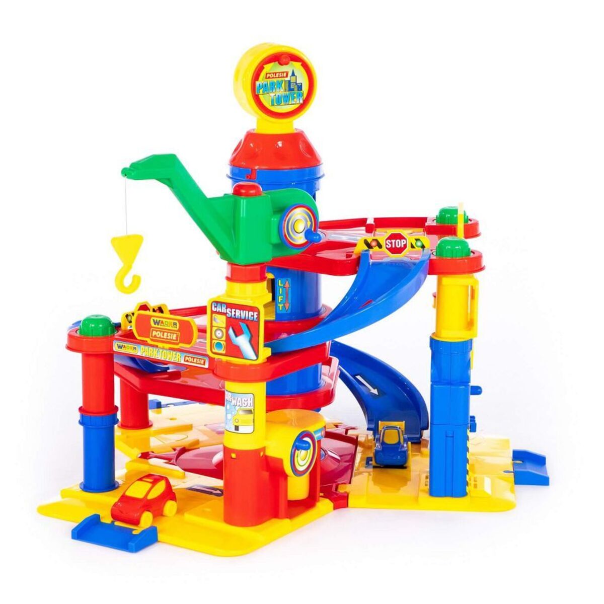 Паркинг представляет собой четырехуровневую парковку. На парковку автомобили можно поднимать на лифте, а спускать по съездам. Входящие в набор машинки (2 шт.) можно обслужить в игрушечном автосервисе: проверить автомобиль на подъёмнике, «помыть» на автомойке, а заправить на АЗС. Лифт, мойка и эстакада приводятся в движение при вращении установленных рукояток, так же как и подъёмный кран.