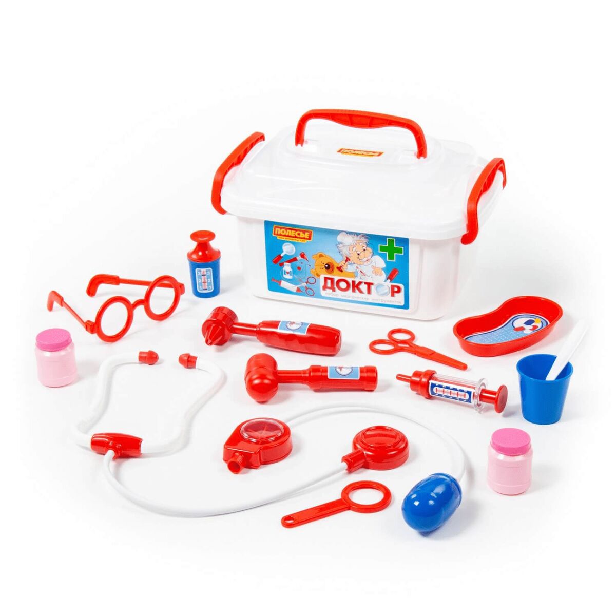 Игра «в доктора» станет ещё интереснее с набором от компании «Полесье». Малыш сможет быстро оказать помощь своим пациентам и, возможно, именно с этой игрушки у ребёнка проснётся интерес к профессии врача. В этом ему помогут игрушечные медицинские принадлежности в контейнере, которые удобно хранить и перемещать. В состав набора входят: