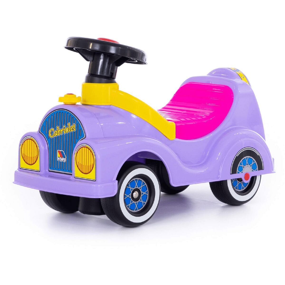 «Кабриолет» — автомобиль-каталка сиреневого цвета с розовым сиденьем. Каталка предназначена для катания ребёнка, путём отталкивания ножками. Руль автомобиля с музыкальным сигналом, под сиденьем находится багажник для любимых небольших игрушек малышки. Катание развивает первоначальные движения и общую координацию ребенка, способствует его физическому развитию.