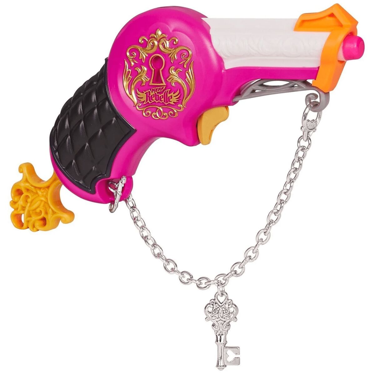 Корпус игрушки имеет стильный окрас: таинственный черный, яркая фуксия и белый цвета, которые делают оружие оригинальным. Револьвер декорирован цепочкой с ключиком, который вставляется в центр оружия.