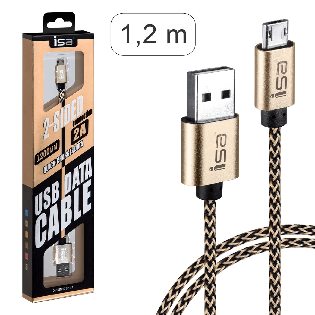 Дата кабель USB — micro USB двусторонний алюминий/текстиль 1,2м 2А золото ISA
