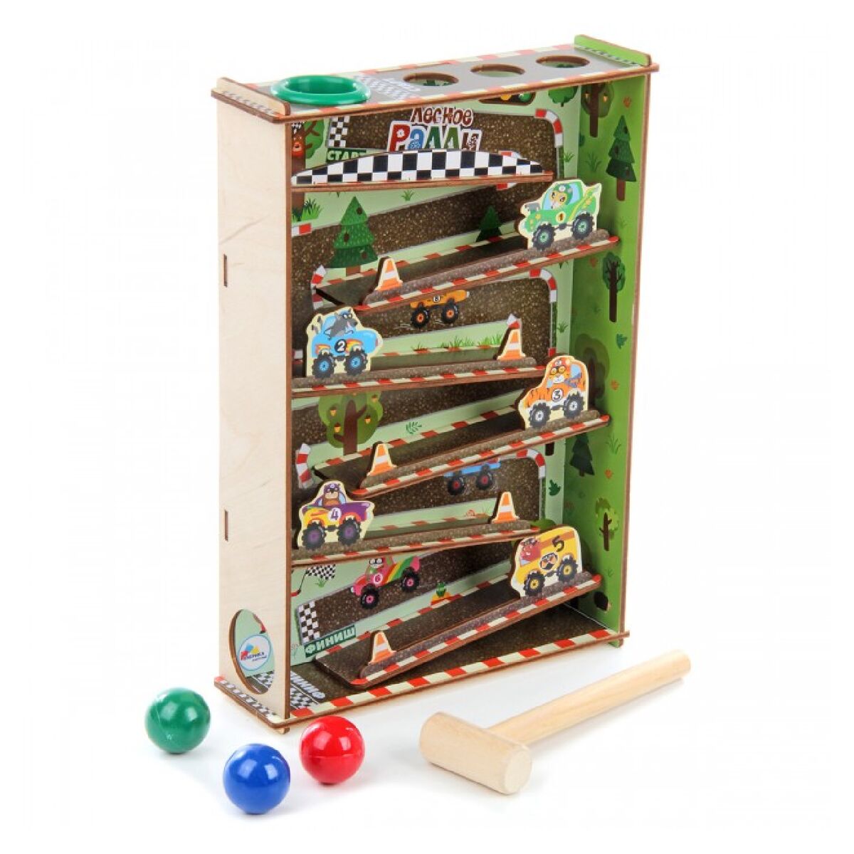 В комплект входят ящичек с дорогой, 3 шарика, молоточек.