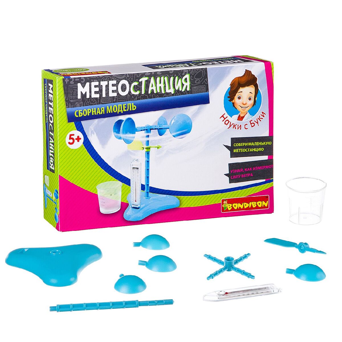 Что такое ветер? Как измеряют его силу? Ответы на эти и другие вопросы ты найдёшь в наборе французских опытов «Метеостанция» от BONDIBON. Собери специальный прибор — ветрометер и проведи серию экспериментов, а поможет тебе в этом подробная инструкция. Также в наборе ты найдёшь градусник для проведения ежедневных измерений и отслеживания изменений в погоде.