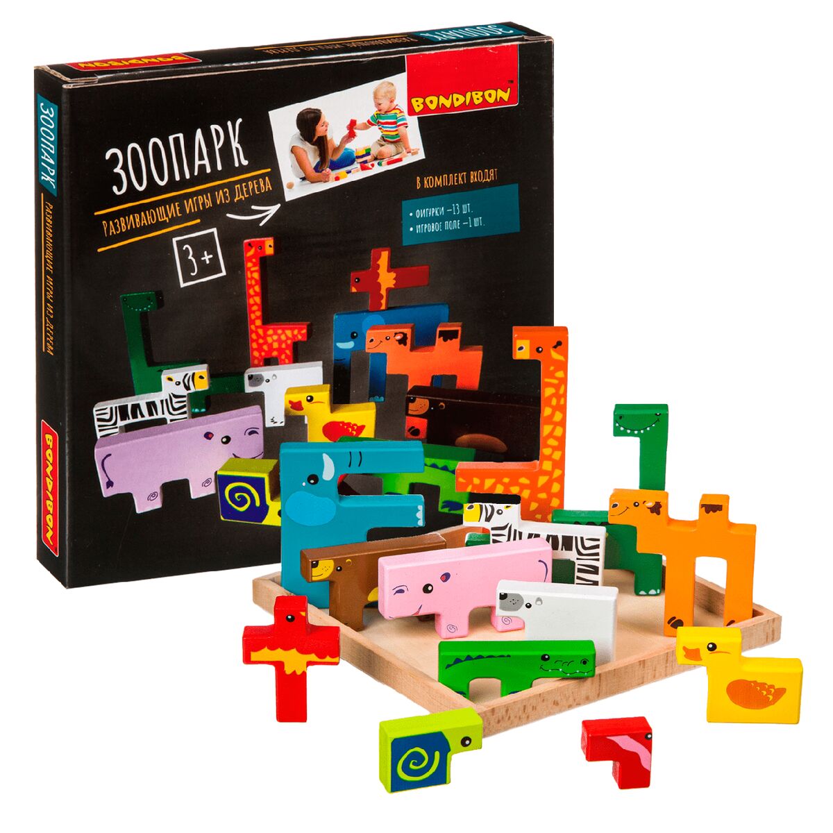 Придумайте с фигурками животных различные сюжетно-ролевые игры, например, в ферму, джунгли и зоопарк. Постройте пирамиду из игрушечных зверей. Любите собирать пазлы? Специально для Вас в комплект входит рамка, на которой можно состыковывать все фигуры. А еще Вы сможете играть в детский тетрис! Деревянная головоломка ЗООПАРК от Бондибон поможет выучить цвета, названия животных, разовьет тактильные навыки, мелкую моторику, логику, пространственное мышление, зрительное восприятие, фантазию, эмоциональный интеллект.