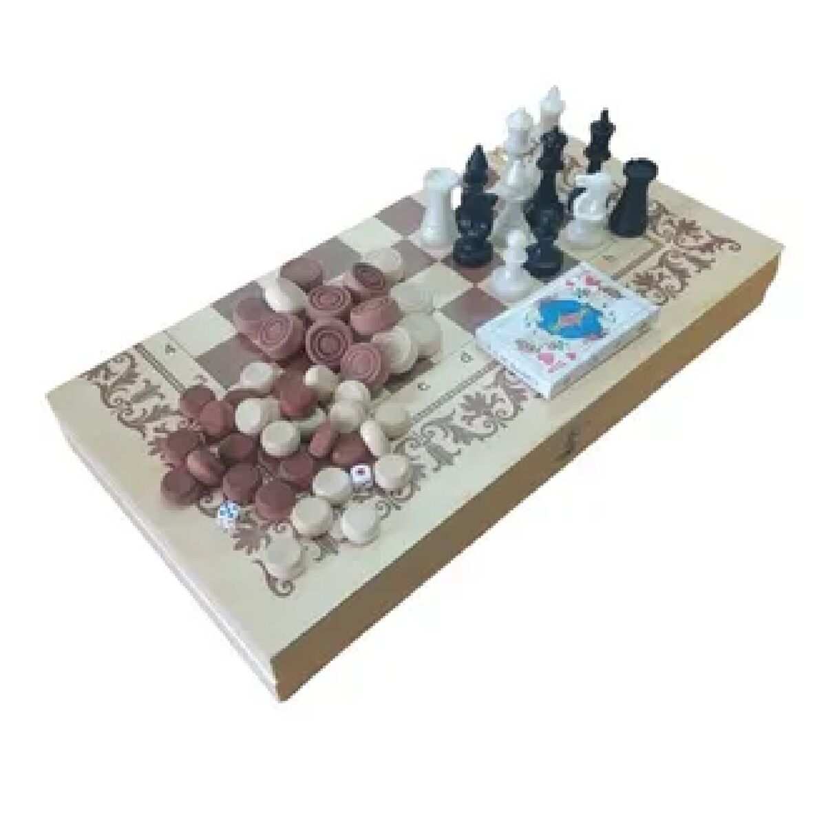 Комплектность: деревянная доска, фишки к нардам (15 белых и 15 черных), шашки (12 белых и 12 черных), шахматы обиходные пластмассовые, кубики, карты игральные