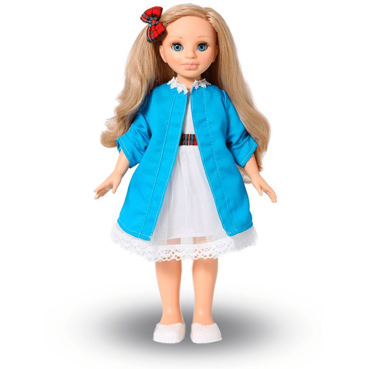Кукла Эсна 5 станет хорошей подружкой для девочки и одной из ее любимых игрушек. У Эсны очаровательное милое личико, выразительные глаза, прошитые густые волосы из качественного нейлона, которые можно укладывать в разные прически. Одежда куклы состоит из платья, легкого приталенного пальто и бантика на голове, на ногах у нее — удобные туфли-балетки. Руки и ноги куклы подвижны, благодаря чему ее можно садить, укладывать спать и переодевать, глаза вставные закрывающиеся. Звуковые устройства отсутствуют.
