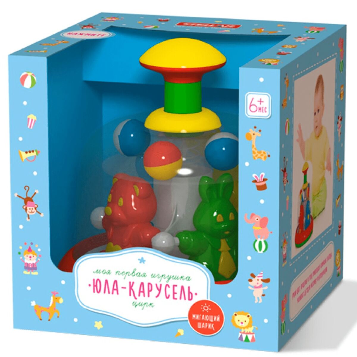 Красочная юла необычной формы имеет прозрачный корпус. Внутри расположены цветные фигурки и шарики. Это замечательный подарок для малыша. Изделие имеет яркую расцветку. Устойчивости игрушке придает плоское дно. При нажатии на ручку разноцветные фигурки в корпусе юлы катаются по кругу. Занятия с игрушкой помогут малышу развить двигательную активность, концентрацию внимания, координацию движений, слух, цветовое и тактильное восприятие.