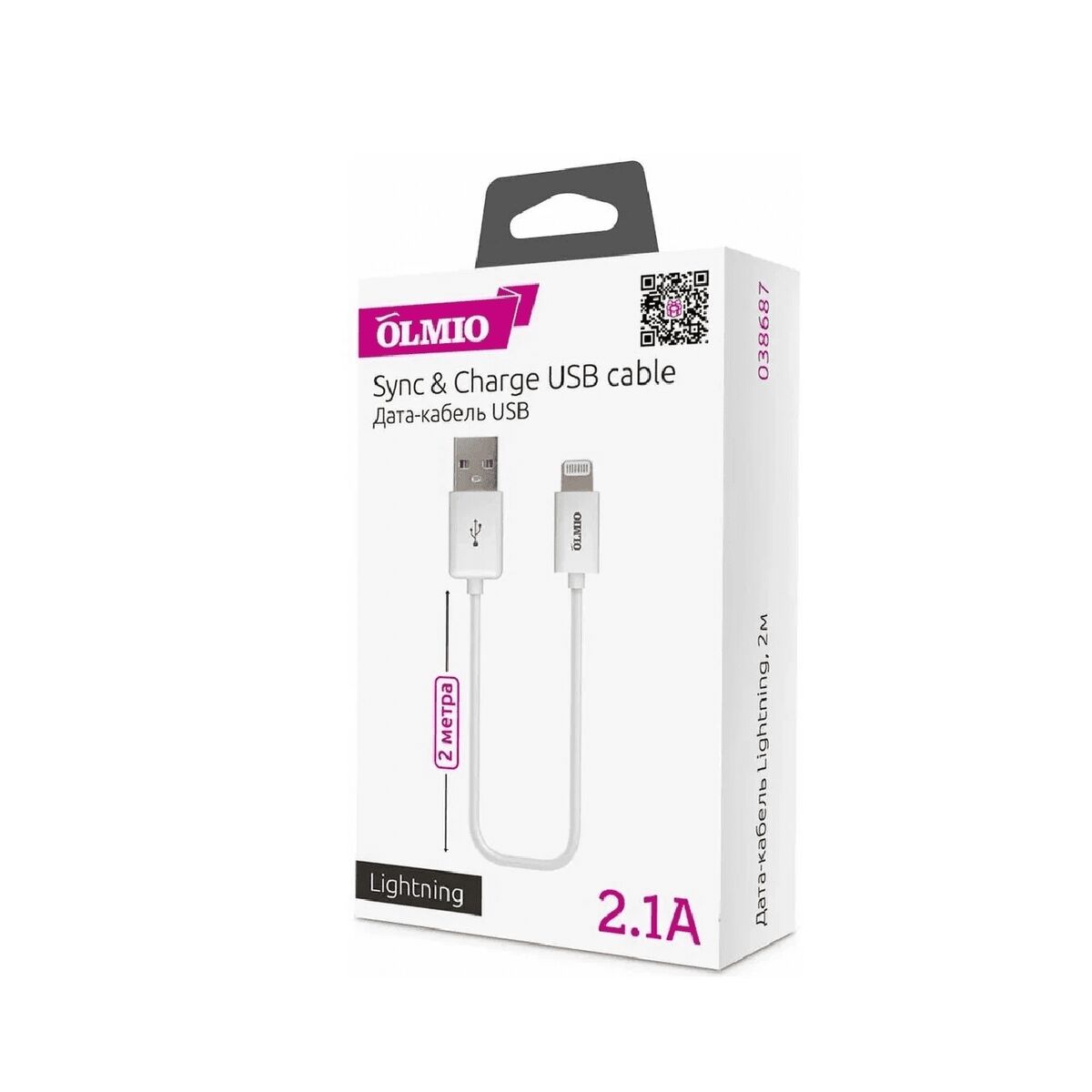 Кабель USB 2.0 — Lightning, для Apple iPhone/iPod/iPad, 2м, белый, OLMIO