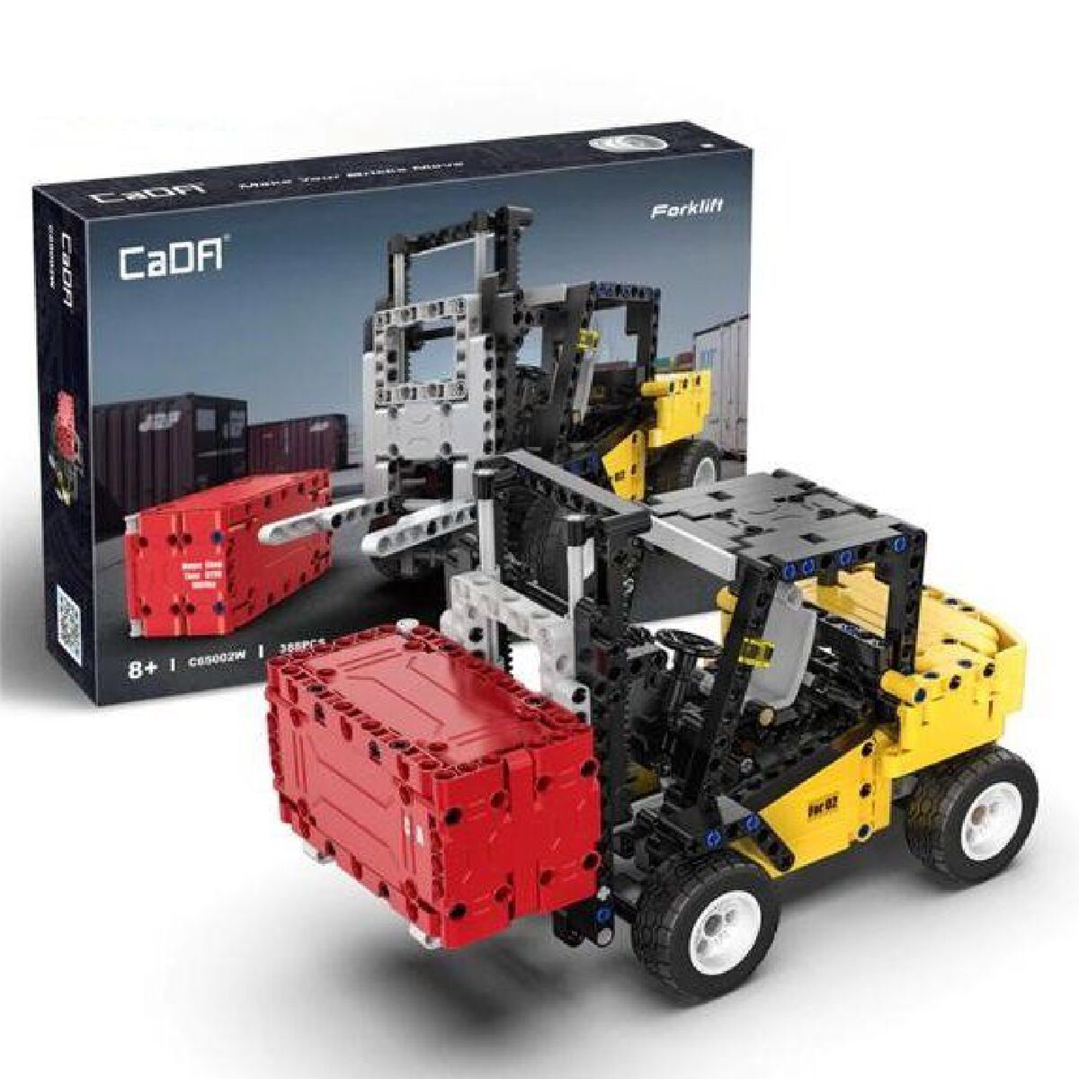 Конструктор от CADA представляет собой набор для постройки вилочного погрузчика из 388 деталей. Вилы поднимаются и опускаются, в комплекте контейнер для перевозки.