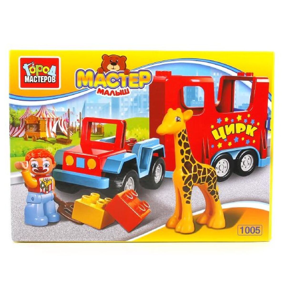 Конструктор Город мастеров Большие кубики: Машина с жирафом с фигуркой совмещает в себе две функции: ребёнок строит цирковой грузовик и играет с ним, моделируя разные сюжеты.