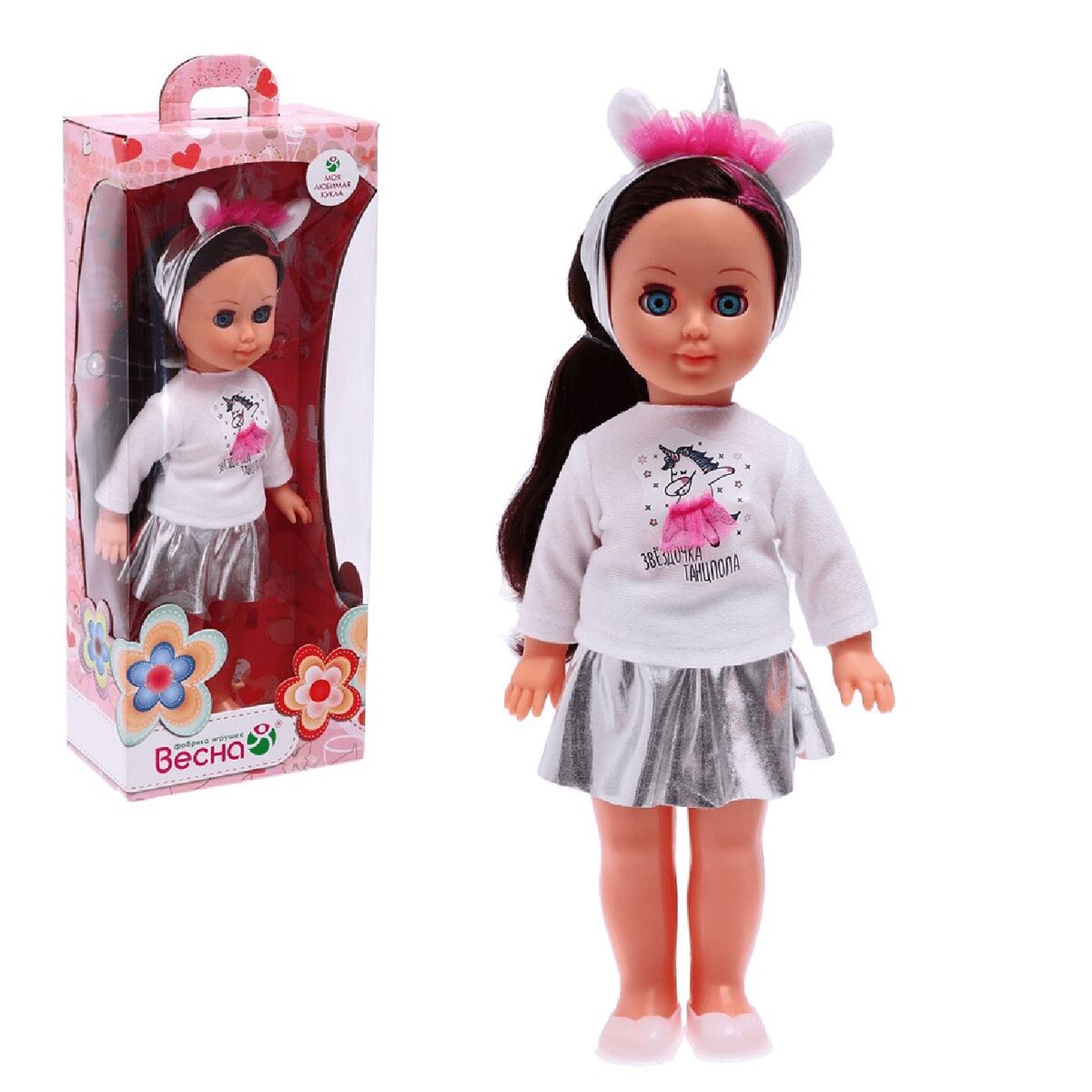 Комплектация: кукла Алла, комплект одежды (кофточка из трикотажного полотна с аппликацией, серебристая юбка, трусики, туфли, ободок)