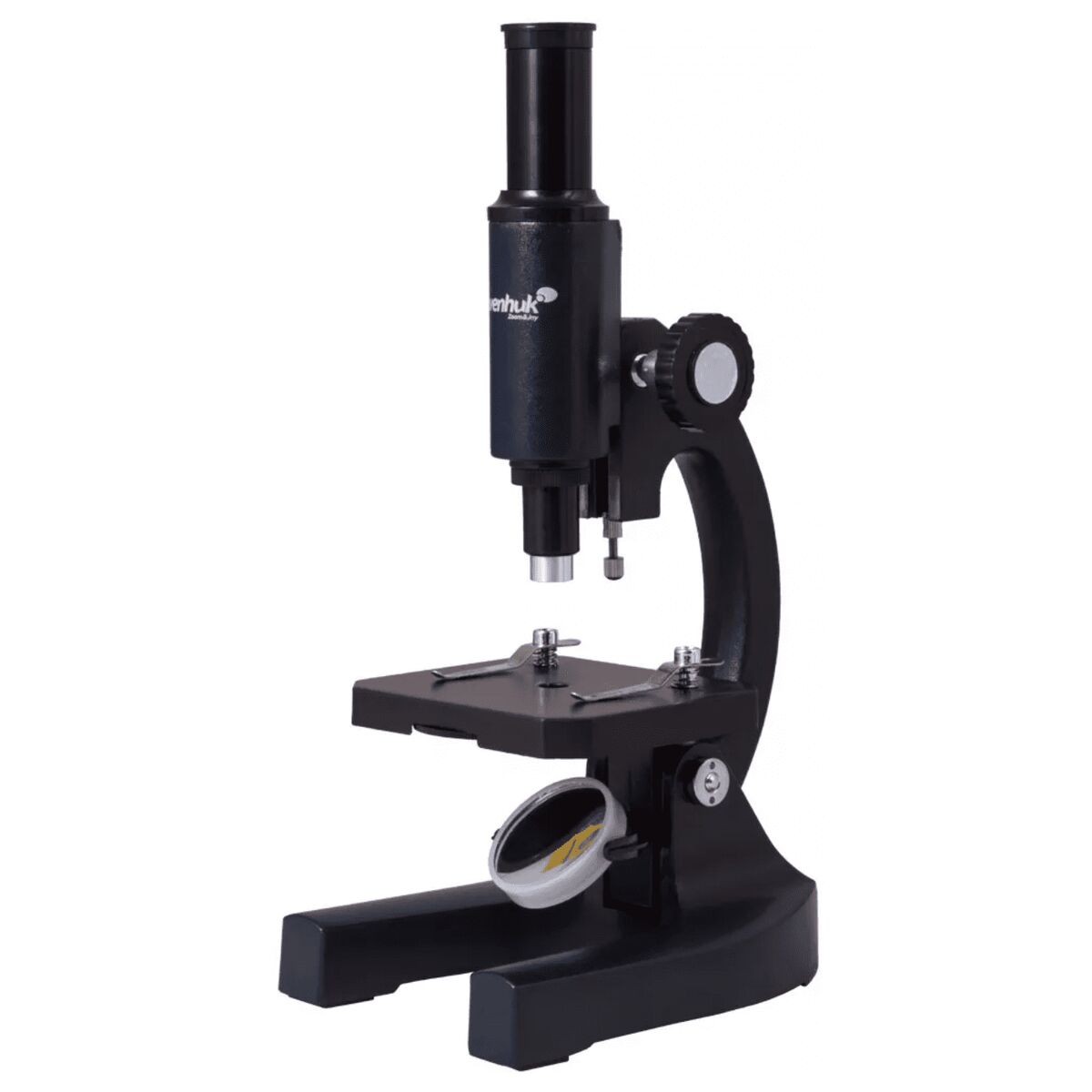 Максимальное увеличение, которое обеспечивает этот микроскоп черного цвета, составляет 200х – этого мало для серьезных исследований, но вполне достаточно для того, чтобы сделать первые шаги в микромир. Окуляр и объектив микроскопа расположены на одной линии, но есть возможность наклонить оптическую трубку микроскопа вместе с предметным столиком для удобства наблюдений (стоит учесть что при работе с жидкими микропрепаратами возможно их стекание).