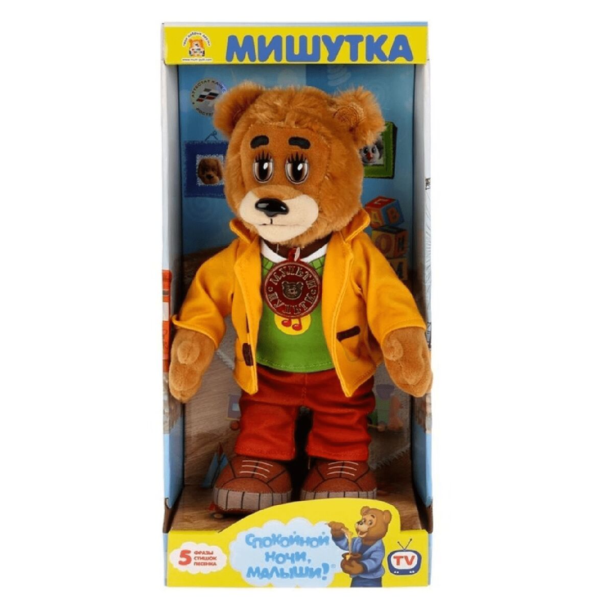 Очаровательный Мишутка одет в жёлтую курточку и оранжевые штанишки. С этой игрушкой дети смогут воссоздать уже знакомые и придумать совсем новые сюжеты для игры. Ребёнку не придётся скучать по любимому герою, ведь теперь он всегда будет с ним! Мишутка будет рад встрече со своими друзьями. Собери всю коллекцию мягких игрушек из телепередачи «Спокойной ночи, малыши!». Мягкую игрушку удобно брать в гости, на прогулки и в поездки.