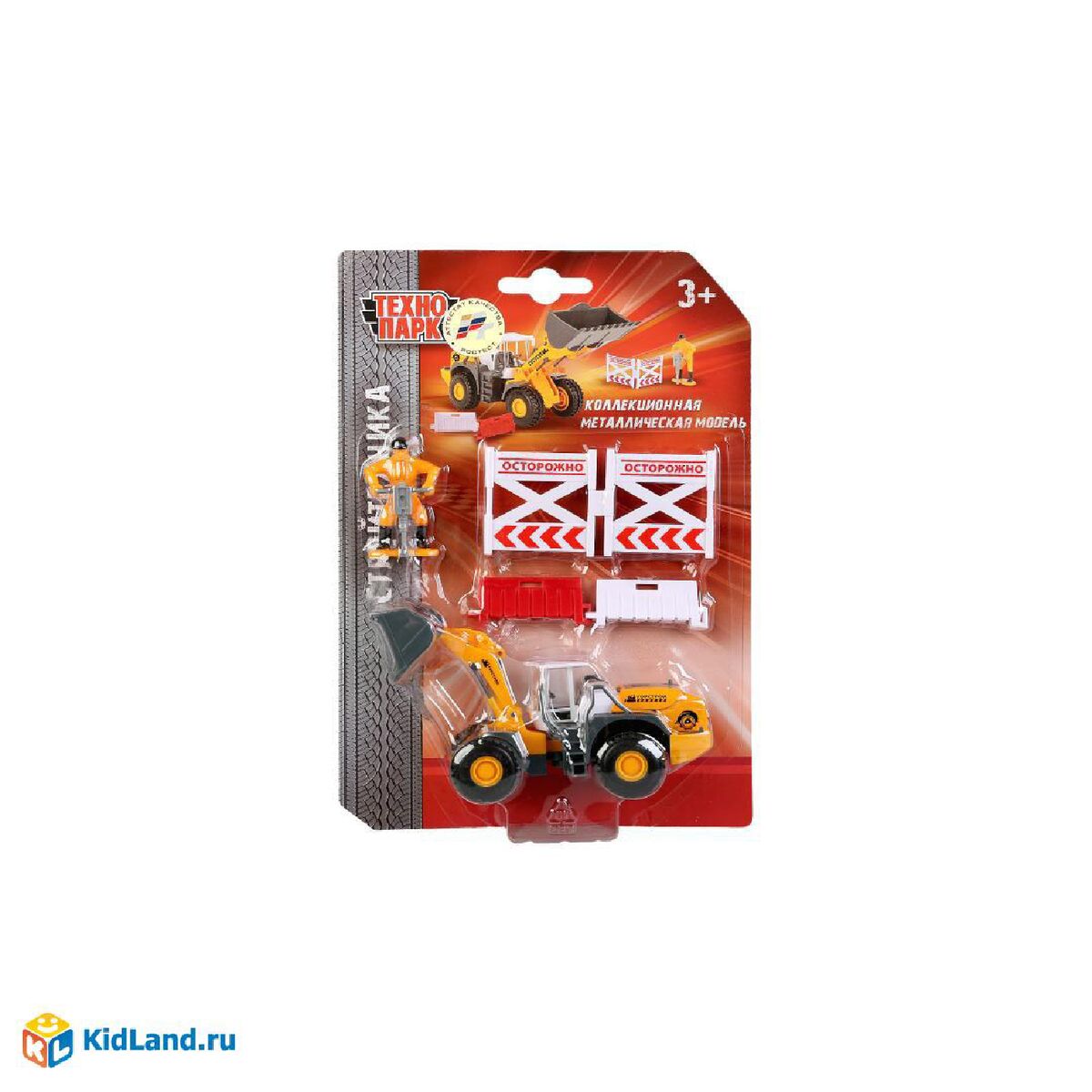 НАБОР «СТРОЙТЕХНИКА» «ТЕХНОПАРК» МЕТАЛЛ. БУЛЬДОЗЕР 12,5СМ, ФИГУРКА, ЗНАКИ НА БЛИСТЕРЕ в кор.8*6шт