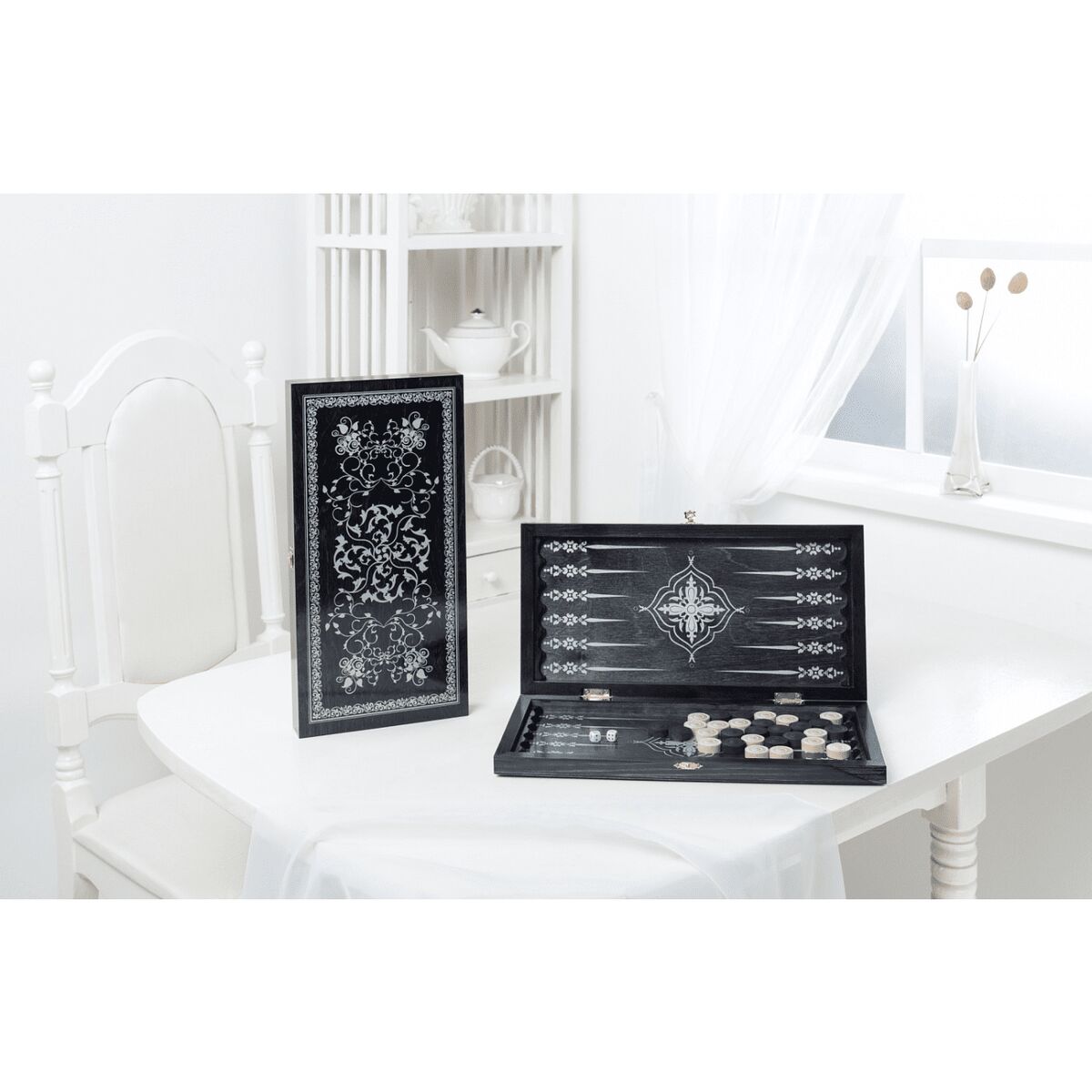 Нарды малые «Вьюн» (400*200*40) черные,рисунок серебро