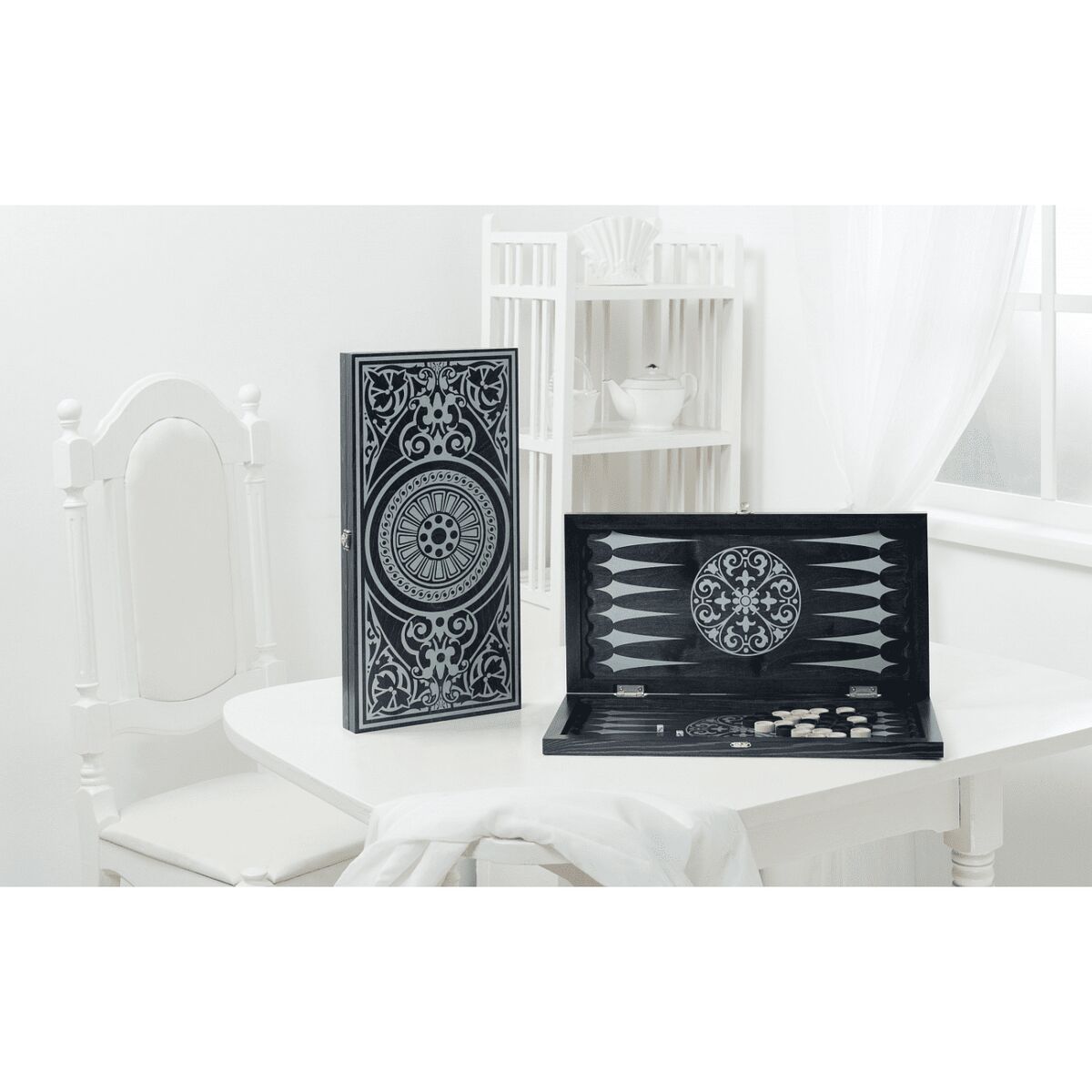 Дерево хвойных, лиственных пород. Фанера мореная в черный цвет, рисунок (шелкография) серебро, покрытие грунт, лак. Деревянные фишки – (высота 10 мм*d25) – 30 шт. (15 светлых, 15 темных), зары (пластмассовые кубики) – 2 шт. Размер доски (480*240*40) в термоупаковке. Игра — нарды.