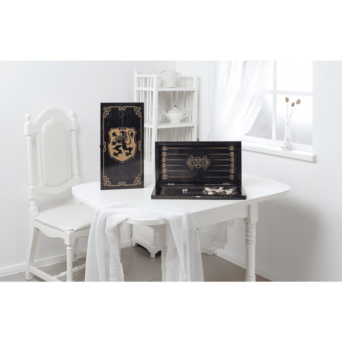 Дерево хвойных, лиственных пород. Фанера мореная в черный цвет, рисунок (шелкография) золото, покрытие грунт, лак. Деревянные фишки – (высота 10 мм*d25) – 30 шт. (15 светлых, 15 темных), зары (пластмассовые кубики) – 2 шт. Размер доски (480*240*40) в термоупаковке. Игра — нарды.