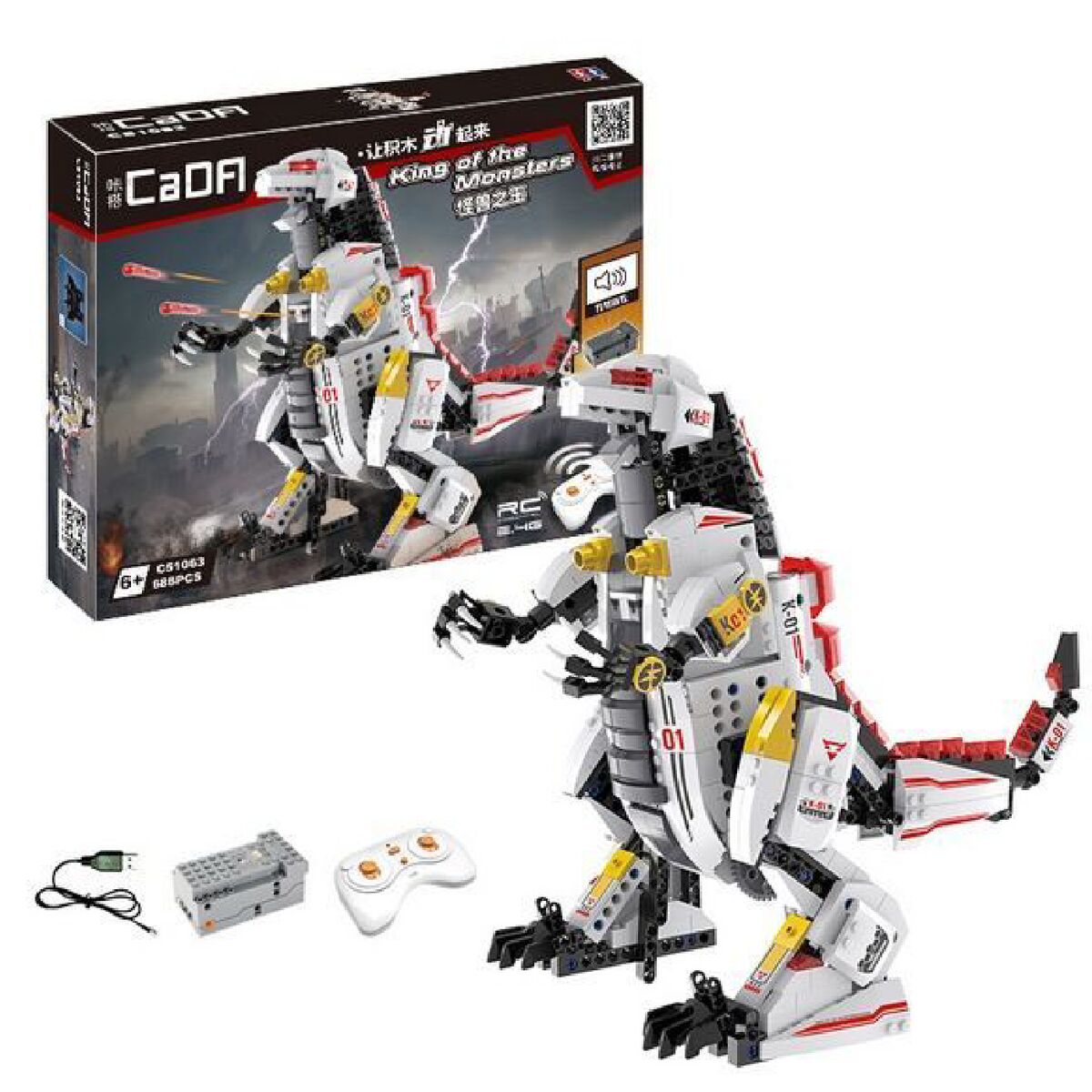 Детский конструктор CaDa С51063W погрузит вас в мир фантазий и позволит собрать робота Король Монстров на радиоуправлении из 688 деталей. Он может ходить вперед / назад, стрелять, качать хвостом, двигать головой и реветь. В комплект входит удобный пульт на 2,4 ГГц, зарядное устройство и литиевый аккумулятор 3,7V.