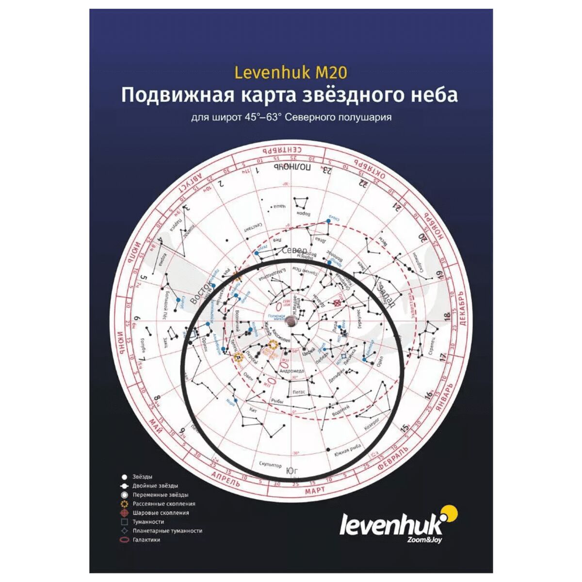 Подвижная карта Levenhuk M20 создавалась для широт 45–63° Северного полушария (для ориентировки: широта Москвы – около 56°, Петрозаводска – около 62°). Т. е. в подвижном круге вы увидите созвездия, которые можно наблюдать именно в этих широтах.