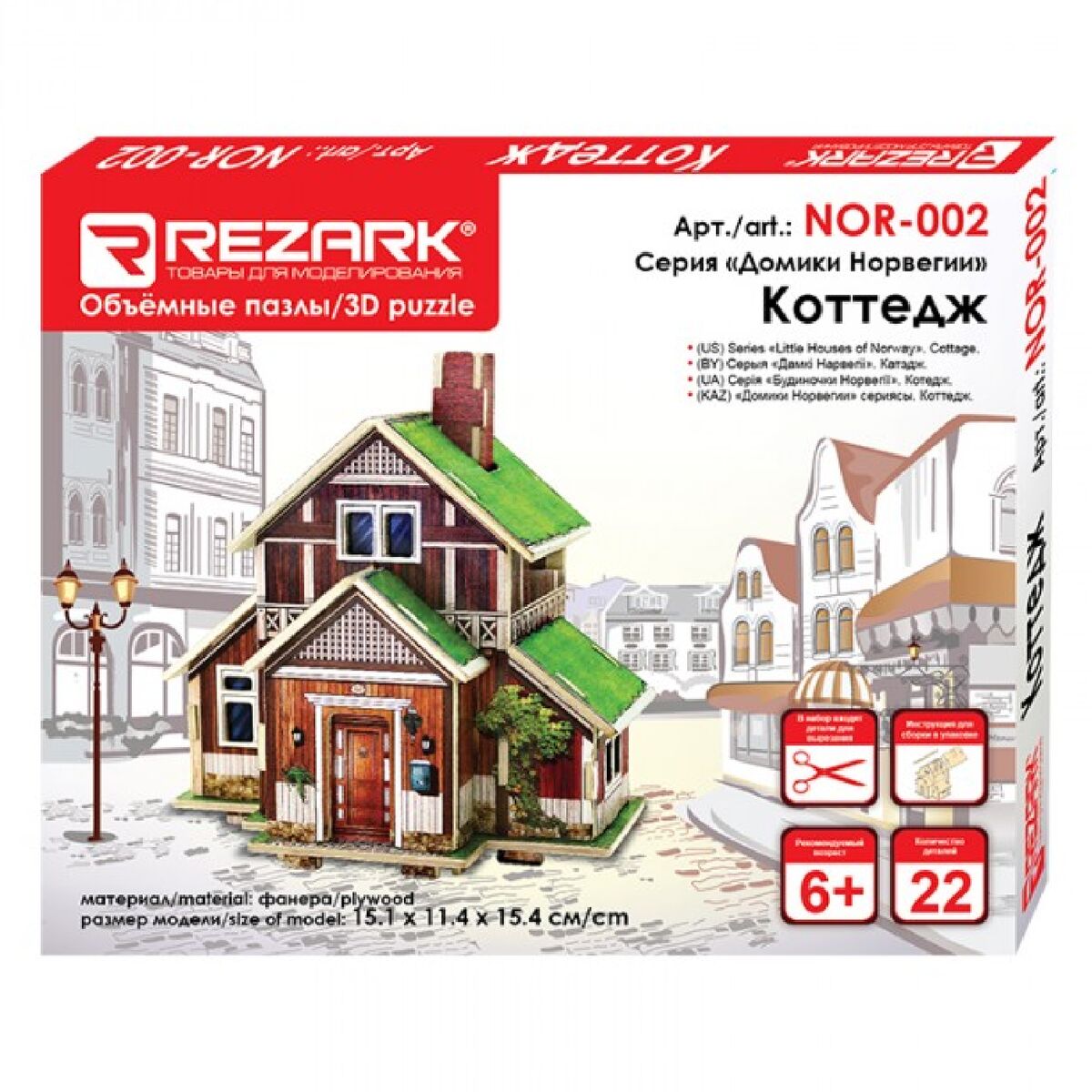 Серия состоит из 2х наборов: Вокзал, Коттедж.Технология сборки: все наборы скрепляются между собой при помощи пазов. При сборке не требуются клеевые материалы. В набор входят детали для вырезания. В комплекте имеется подробная инструкция по сборке на русском языке, которая будет понятна и взрослому и ребенку.