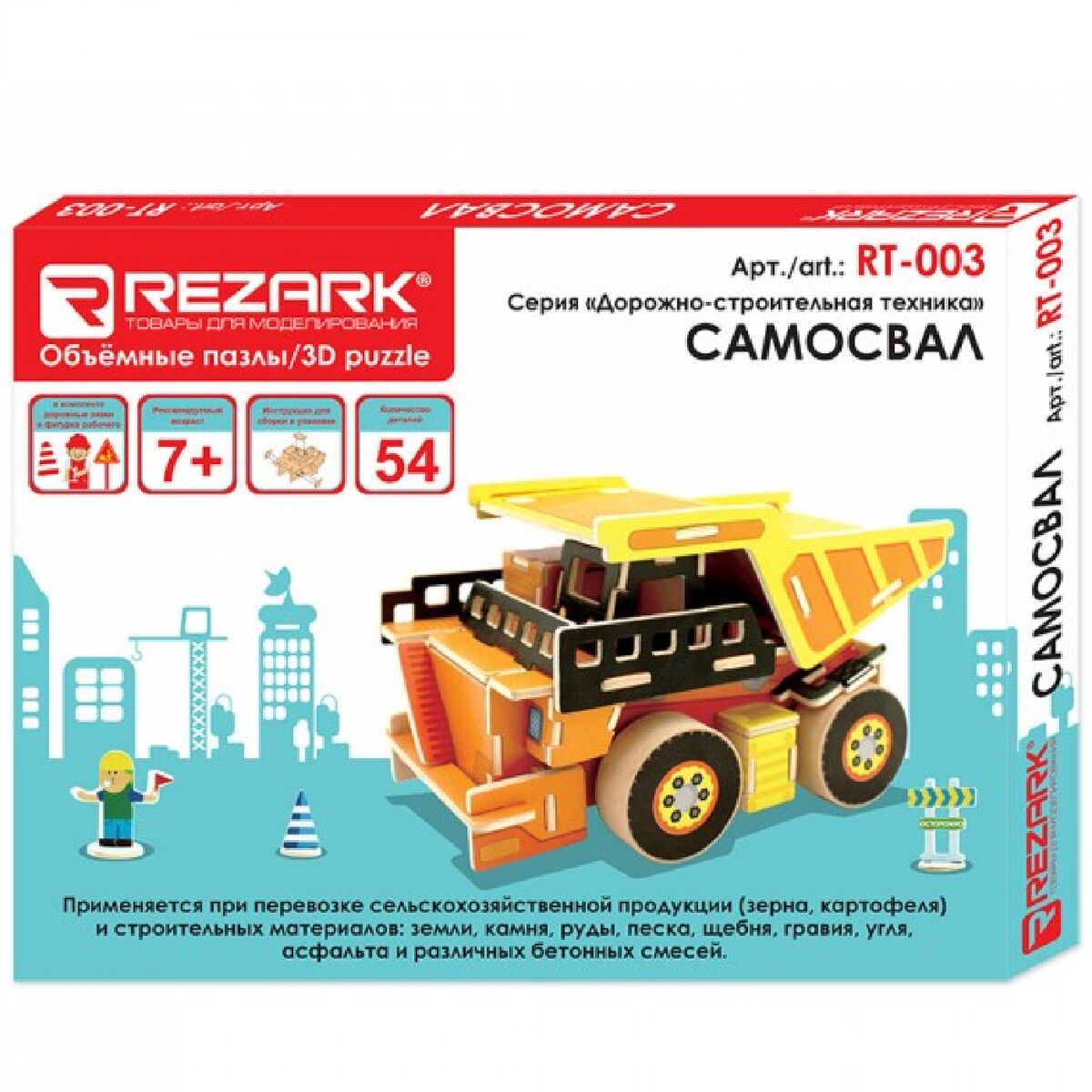 Rezark представляет детские, развивающие 3D-наборы для сборки, изготовленные из качественной фанеры. Данная серия посвящена дорожно-строительной технике. В состав набора входят детали пазла и иллюстрирующие их самоклеящиеся наклейки.Это и игрушка, и конструктор «два в одном». Сборка из 3D-пазлов развивает моторику рук, объёмное мышление и внимание. А подвижные элементы модели позволяют использовать её как полноценную игрушку, с которой можно играть, строить, перевозить и т.д.