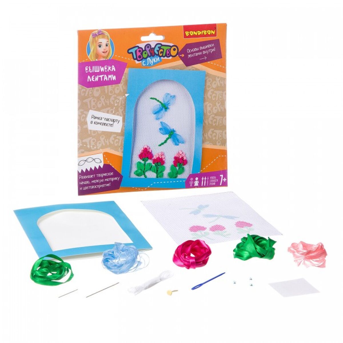 Bondibon Набор для творчества Вышивка лентами Клевер и стрекозы — чудесный вид творчества, он менее кропотливый, чем вышивка крестиком и более эффектный и объемный в результате